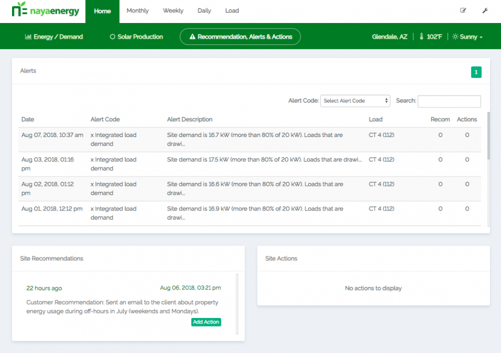By using your real-time energy data and rate plan information, Naya technology will generate custom alerts based on status of your equipment, along with recommendations that can be assigned to a team member to take preventative action.